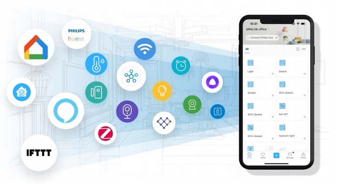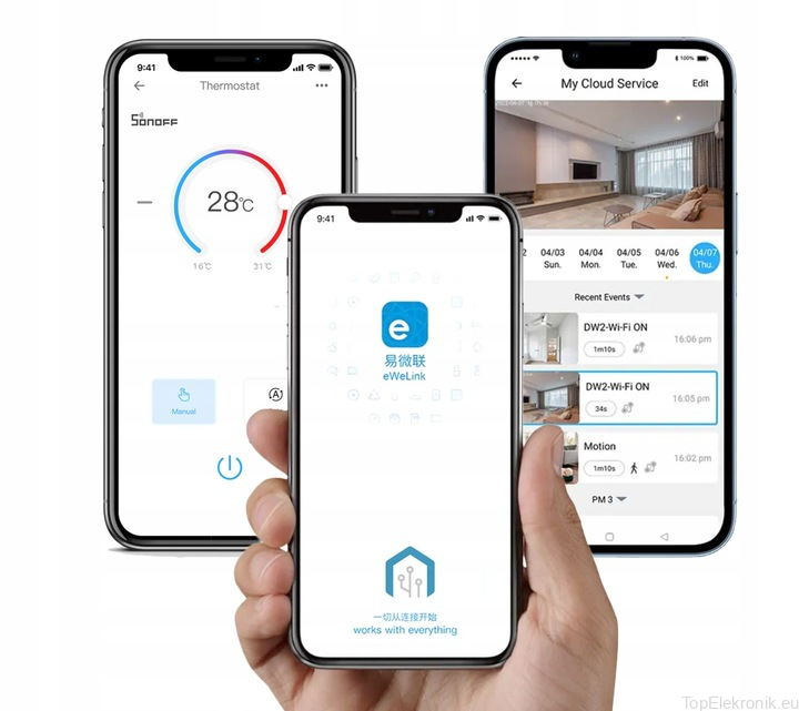 eWeLink nie wymaga żadnych centralek, HUBów i koncentratorów. Potrzebujesz tylko WiFi z dostępem do Internetu. Możesz sterować urządzeniami z każdego miejsca na świecie.