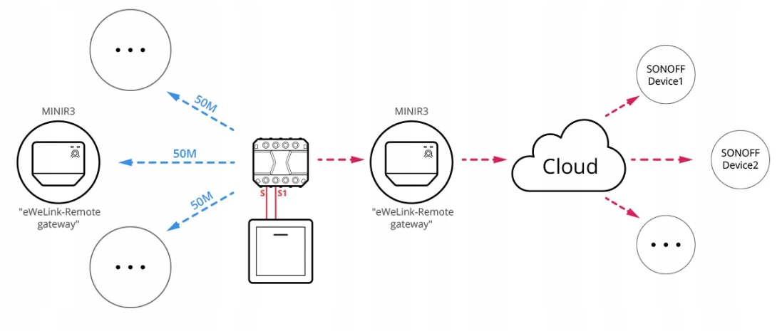 Dzięki temu coraz więcej akcesoriów ekosystemu Sonoff może komunikować się bezpośrednio ze sobą, z pominięciem chmury i WiFi przy pomocy bluetooth. Wykorzystując dodatkowe bateryjne piloty dedykowane eWelink Remote np. M5 lub moduły SMATE otrzymujemy możliwość tworzenia układów schodowych, krzyżowych i innych bez potrzeby prowadzenia przewodów do dodatkowych włączników ściennych...
