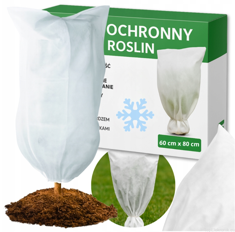 Kaptur ochronny wykonany jest z grubej białej agrowłókniny zimowej o gramaturze 50 gram, dzięki temu jest mocniejszy i trwalszy.