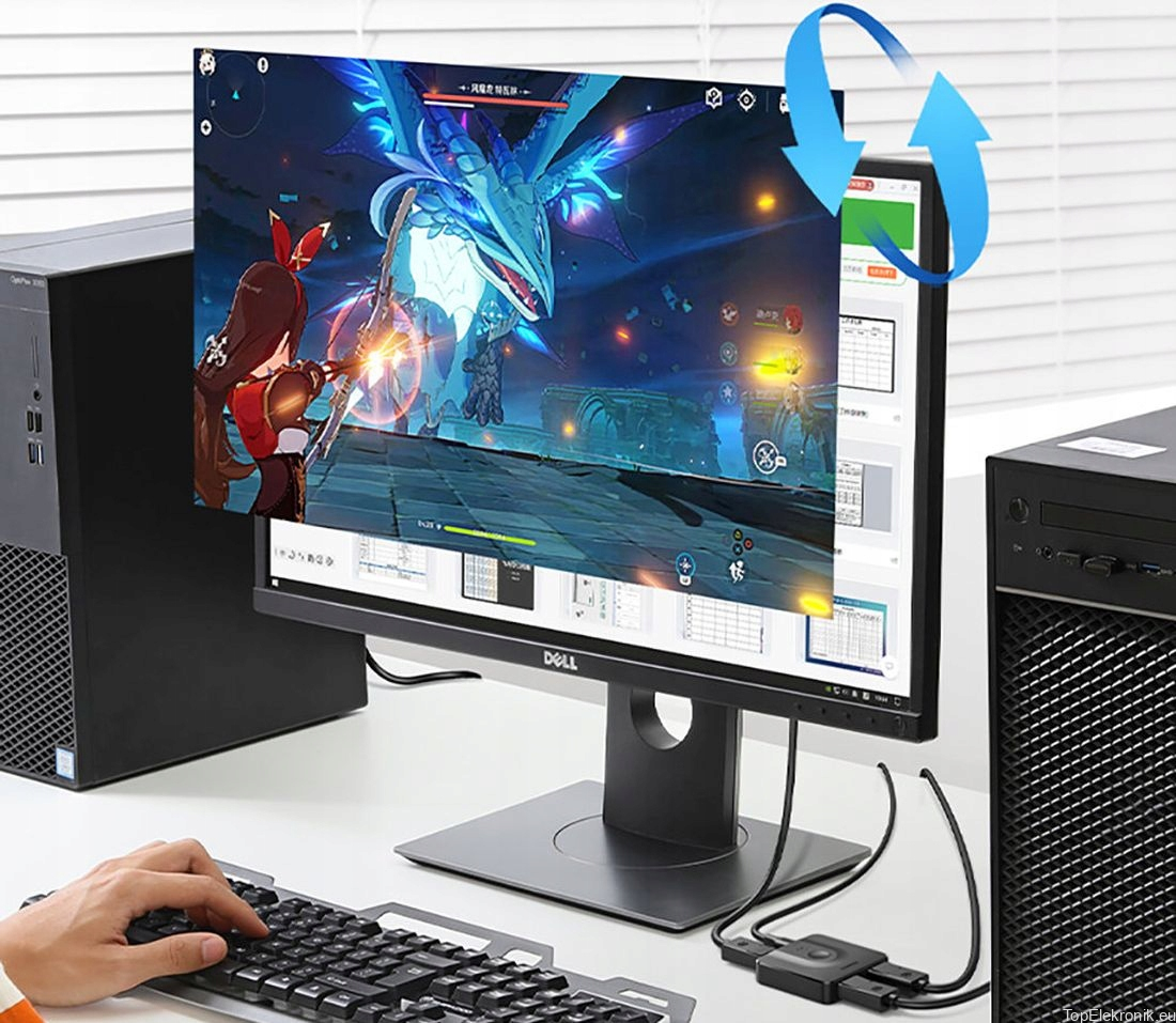 Rozdzielacz (switch) DisplayPort to niewielkie urządzenie pozwalające na podłączenie do jednego wejścia DisplayPort dwóch źródeł obrazu. Przy pomocy przycisku można przełączać się miedzy źródłami np Komputer / konsola