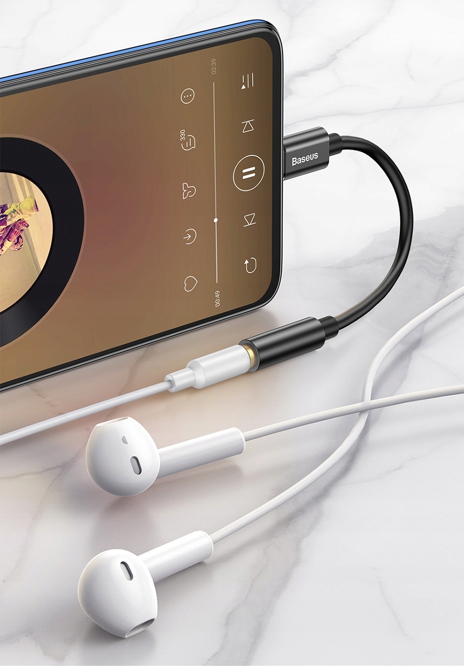 Wysokiej jakości przewód Baseus pozwala na równoczesne ładowanie smartfona oraz słuchanie muzyki.