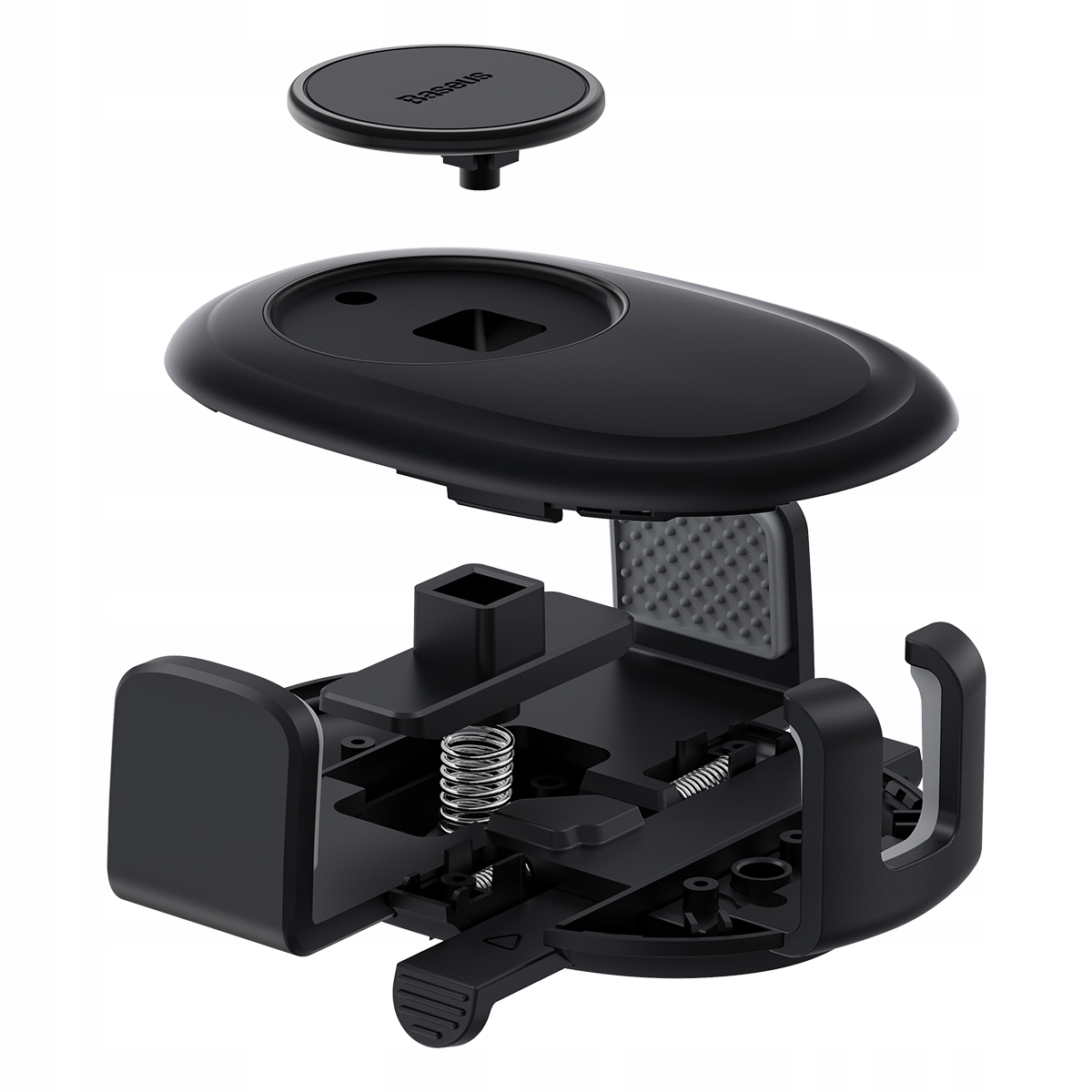 Uchwyt blokuje ramiona dzięki ciężarowi telefonu, który dociska okrągły przycisk na płytce uchwytu - mocny ścisk utrzyma Twój sprzęt nie pozwalając mu się odczepić czy wypaść.