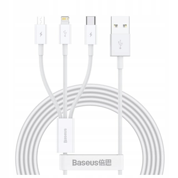 Kabel Baseus CAMLTYS-02 umożliwia szybkie ładowanie Twojego telefonu. Pozwala też przesyłać pliki z prędkością do 480 MB/s. Wytrzymały i odporny na uszkodzenia - będzie doskonale Ci służył przez długi czas. W zestawie znajdziesz też praktyczny pasek, który ułatwi Ci przechowywanie kabla i zapobiegnie jego plątaniu się. Aż 3 złącza - micro USB, USB-C i lightning, zapewniają szeroką kompatybilność produktu i umożliwiają ładowanie kilku urządzeń jednocześnie.