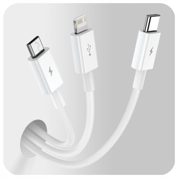 Ten praktyczny kabel wykorzystasz dokładnie tak, jak chcesz. Aż 3 różne wtyczki pasują do wielu urządzeń, które możesz też zasilać jednocześnie. Złącze lightning pozwala na ładowanie iPhone’ów. Umożliwia też szybki transfer plików. Wtyk USB-C jest kompatybilny między innymi ze smartfonami Xiaomi, Samsung czy Huawei. Złącze micro USB pasuje do starszych telefonów z Androidem oraz do niewielkich urządzeń domowych, takich jak na przykład lampki lub wentylatory biurkowe.