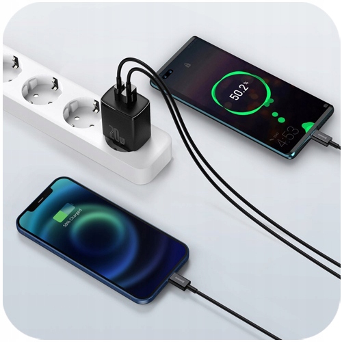 Ładowarka od Baseus pozwoli Ci zrezygnować z noszenia ze sobą dwóch ładowarek. Wszystko za sprawą specjalnego projektu. W górnej części wtyczki znajdują się dwa wejścia USB, pierwsze z nich jest typu C, natomiast drugie typu A. Dzięki temu rozwiązaniu, możesz zrezygnować z dwóch osobnych ładowarek i zastąpić ją jedną, co jest zdecydowanie praktyczniejsze i zajmuje mniej miejsca w torebce czy plecaku. Dodatkową zaletą tego rozwiązania jest możliwość ładowania dwóch urządzeń jednocześnie, zajmując wyłącznie jedno gniazdko.