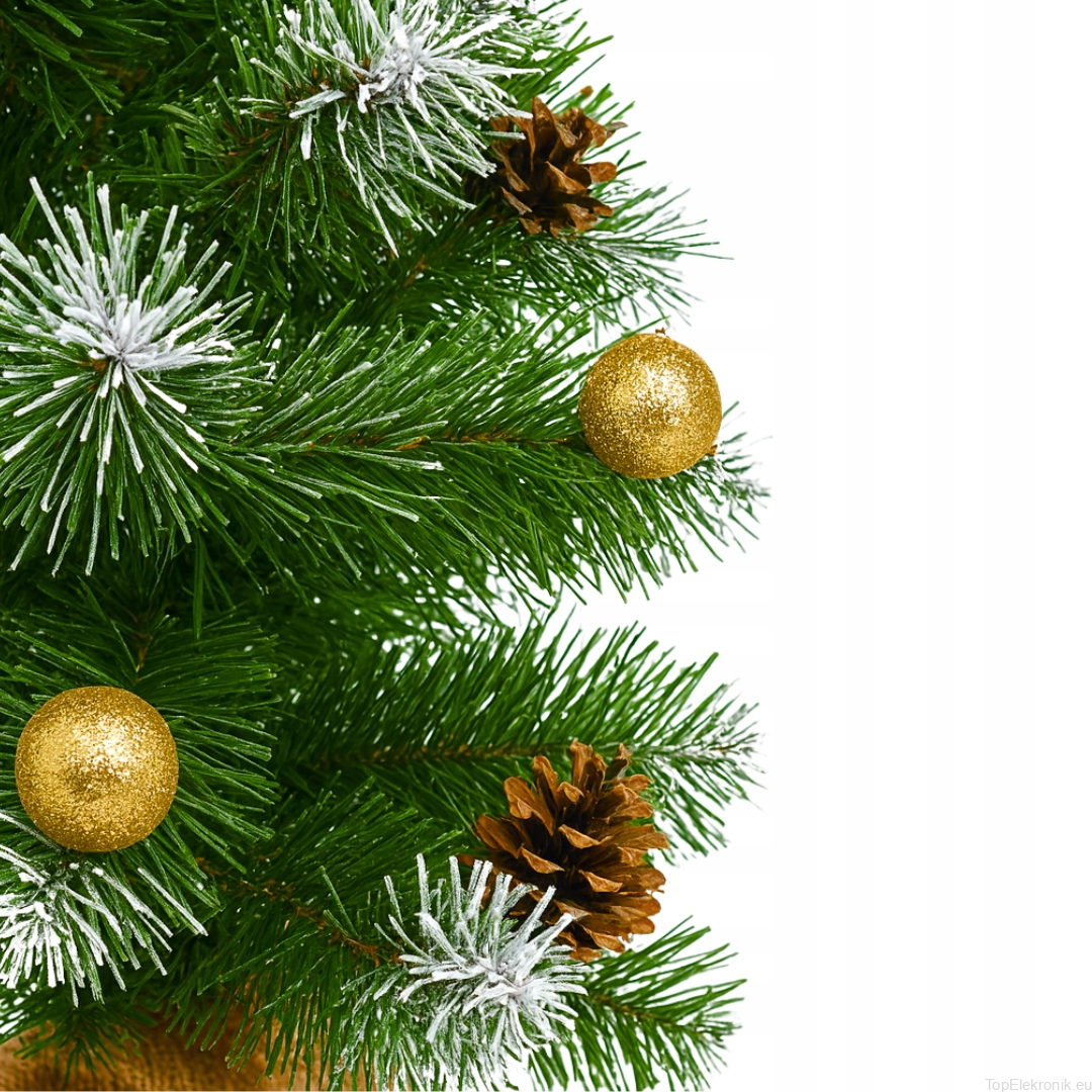 Jest niezwykle gęsta, pokryta farbą imitującą sztuczny śnieg i udekorowana złotymi bombkami oraz prawdziwymi szyszkami.