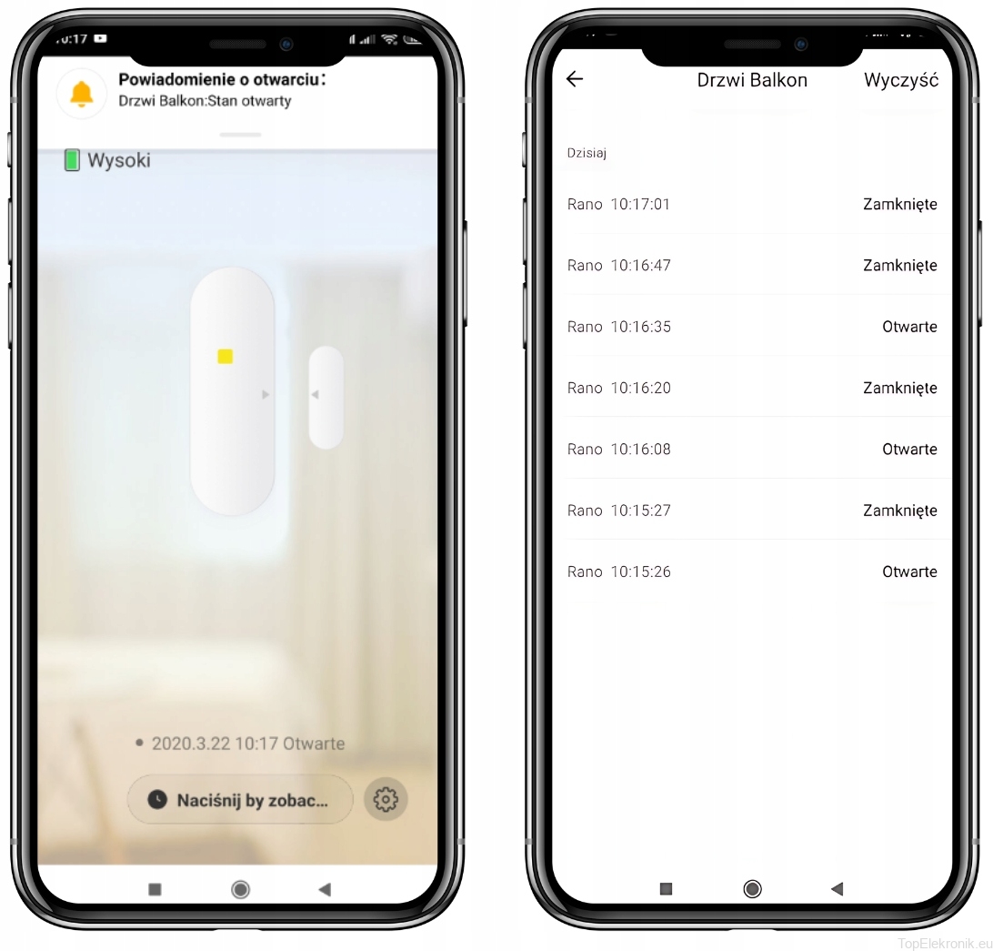Każde naruszenie czujnika (OTWARCIE/ZAMKNIĘCIE) powoduje aktualizację stanu kontaktronu w aplikacji.