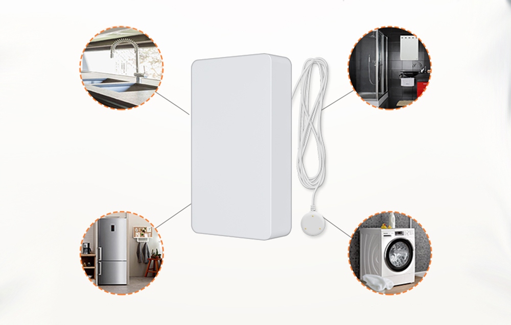 Zamontuj go na przykład obok pralki, wanny, zlewu czy lodówki. Jeżeli nastąpi wyciek, natychmiast się o tym dowiesz – otrzymasz odpowiednie powiadomienie na telefon.