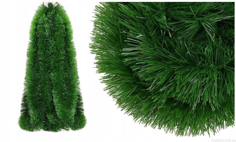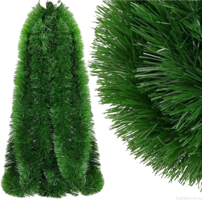 Jest to girlanda wykonana z zielonych igieł, które wyglądają jak igły choinkowe. Ma gęstą strukturę i jest dobrze skonstruowana z mnóstwem igieł, które są mocno skupione razem, tworząc pełne i gęste wykończenie.