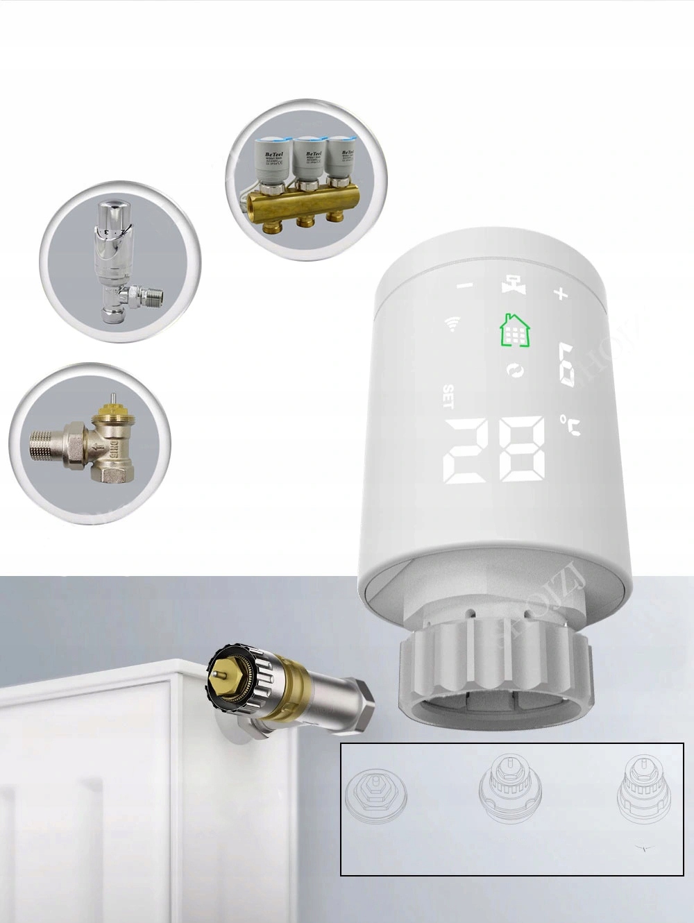 W zestawie odpowiednie akcesoria pozwalające na montaż do wszystkich najpopularniejszych gwintów dla głowic termostatycznych