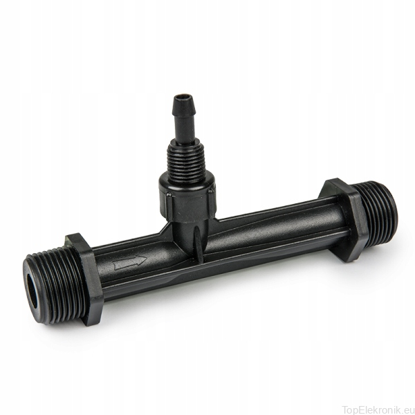 Inżektor do pobierania płynnego nawozu. Wyposażony w dwa gwinty zewnętrzne 3/4" oraz przyłącze do węża zasysającego.