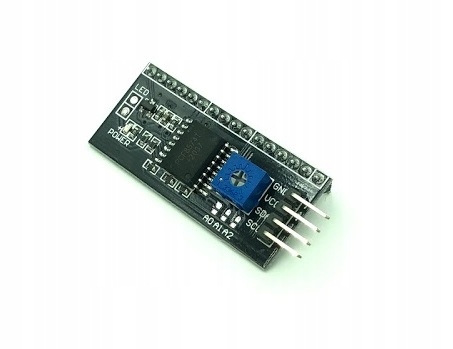 Konwerter I2C. Dzięki niemu nie ma potrzeby prowadzenia do wyświetlacza wielu przewodów sygnałowych (które zajmują wiele pinów w Arduino, ESP). Wszystko oprócz zasilania obsłużysz tylko dwiema liniami SDA oraz SCL.