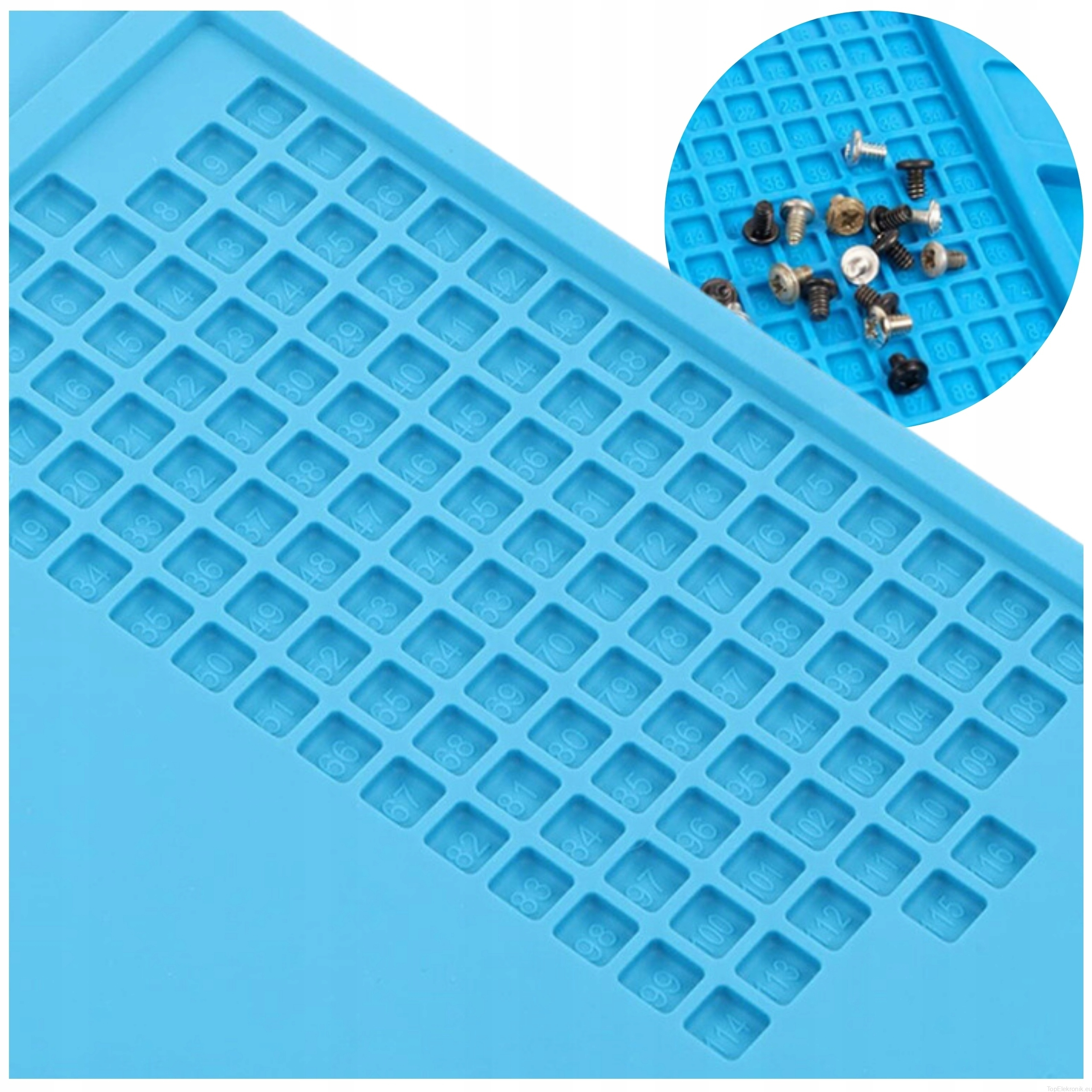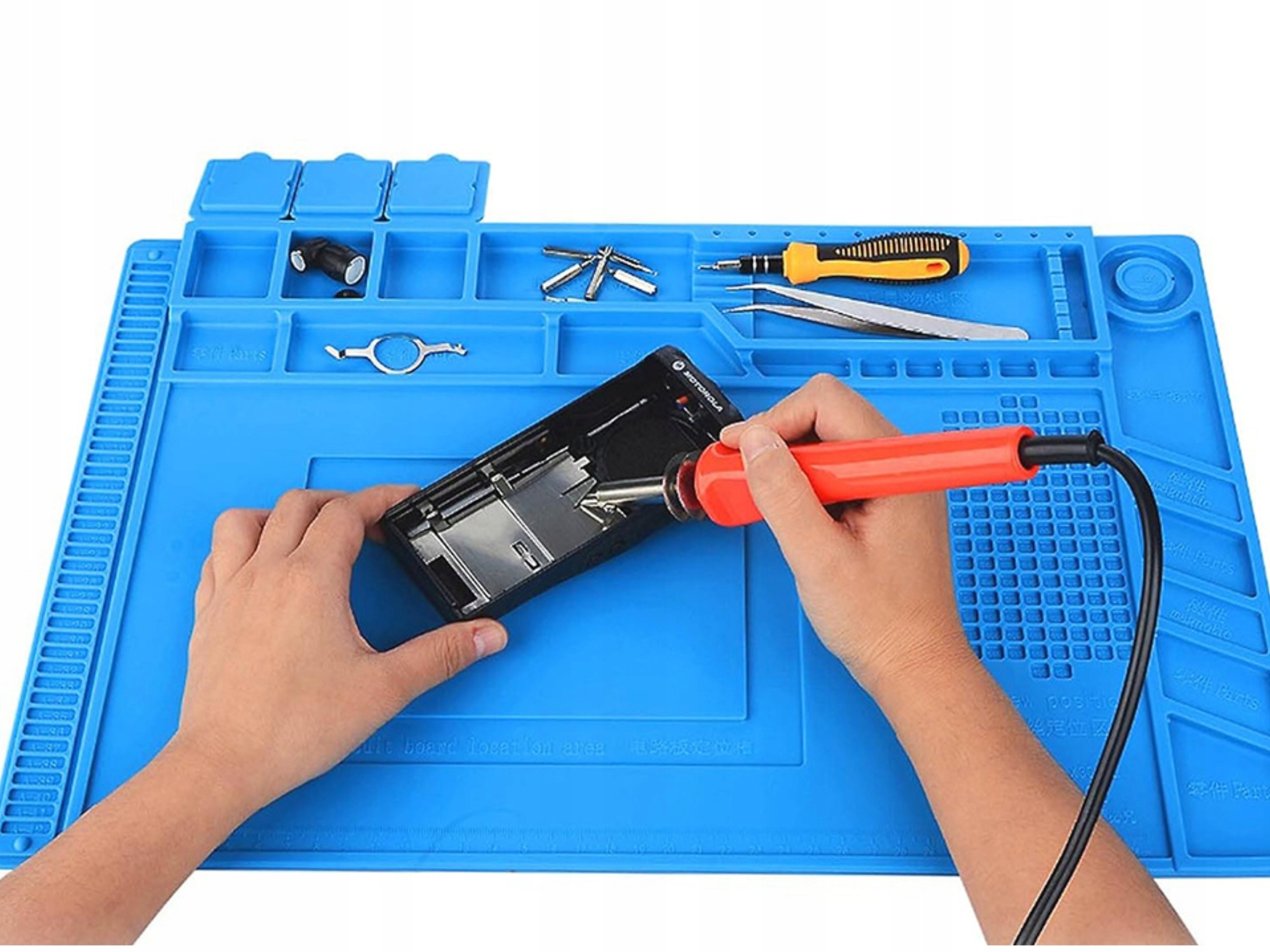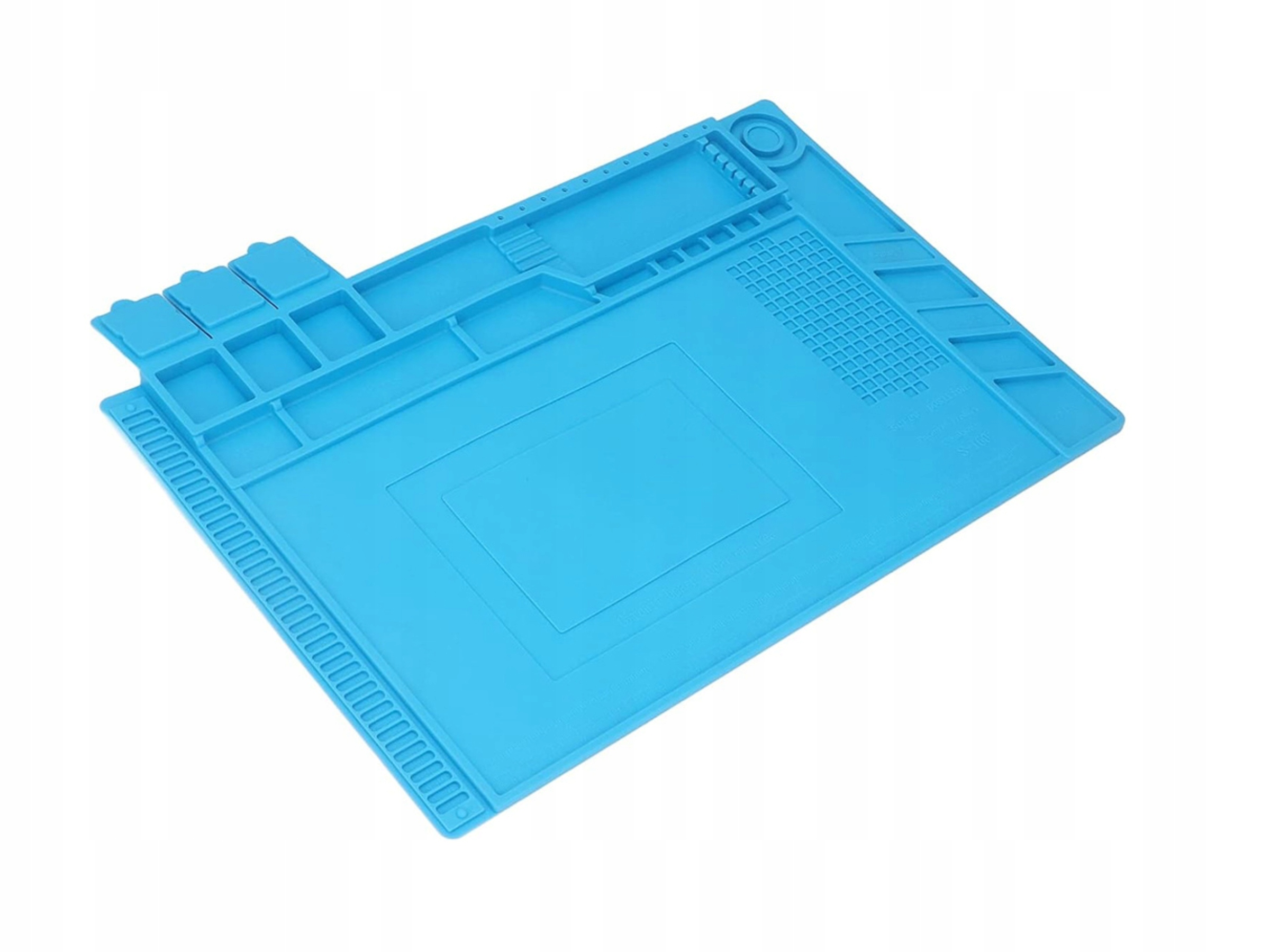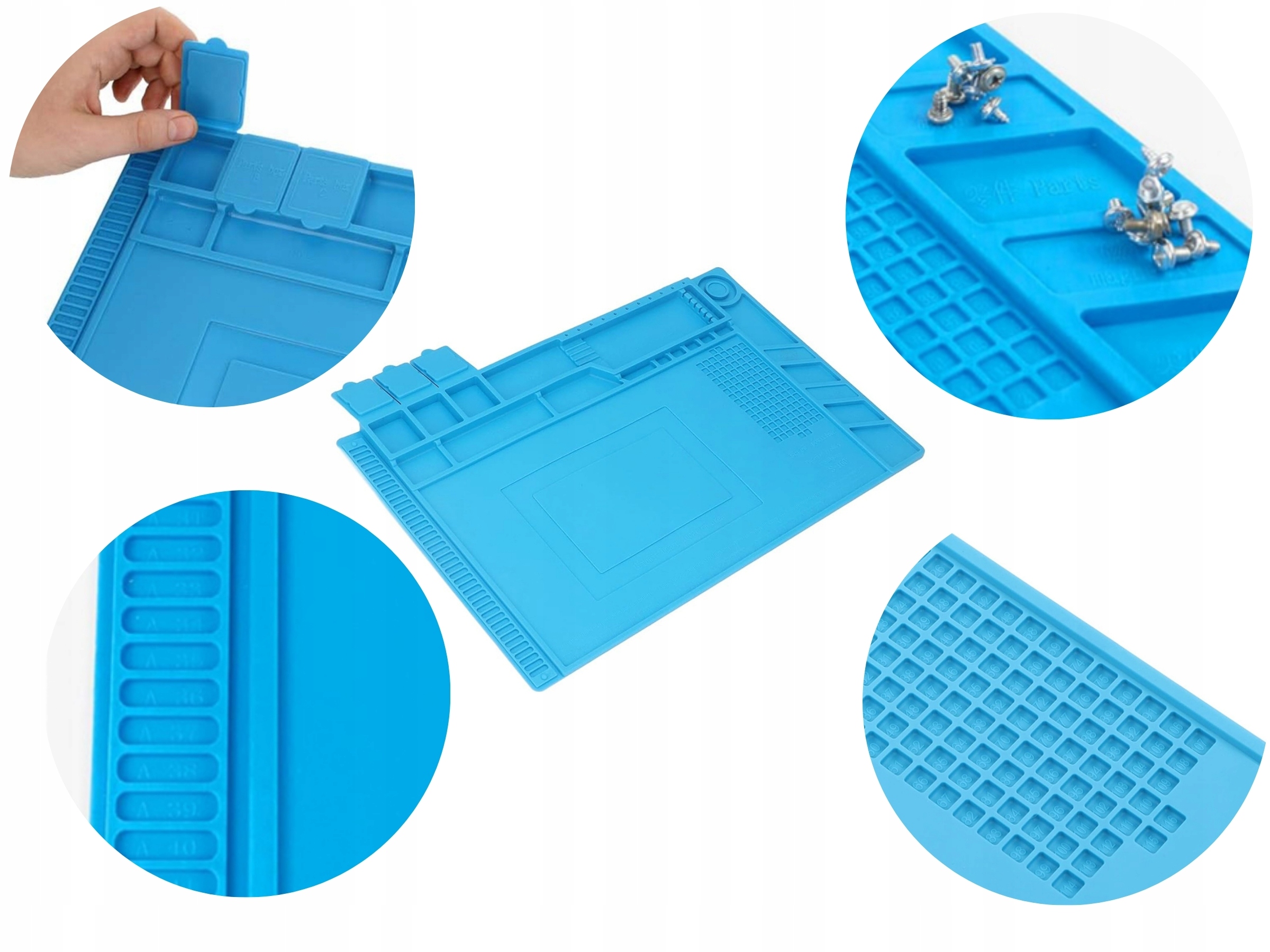 Mata posiada specjalnie wyprofilowane miejsca na narzędzia oraz elementy, co pomaga utrzymać porządek na stanowisku pracy. Dodatkowe przegródki pozwalają oddzielić narzędzia od części naprawianego urządzenia.