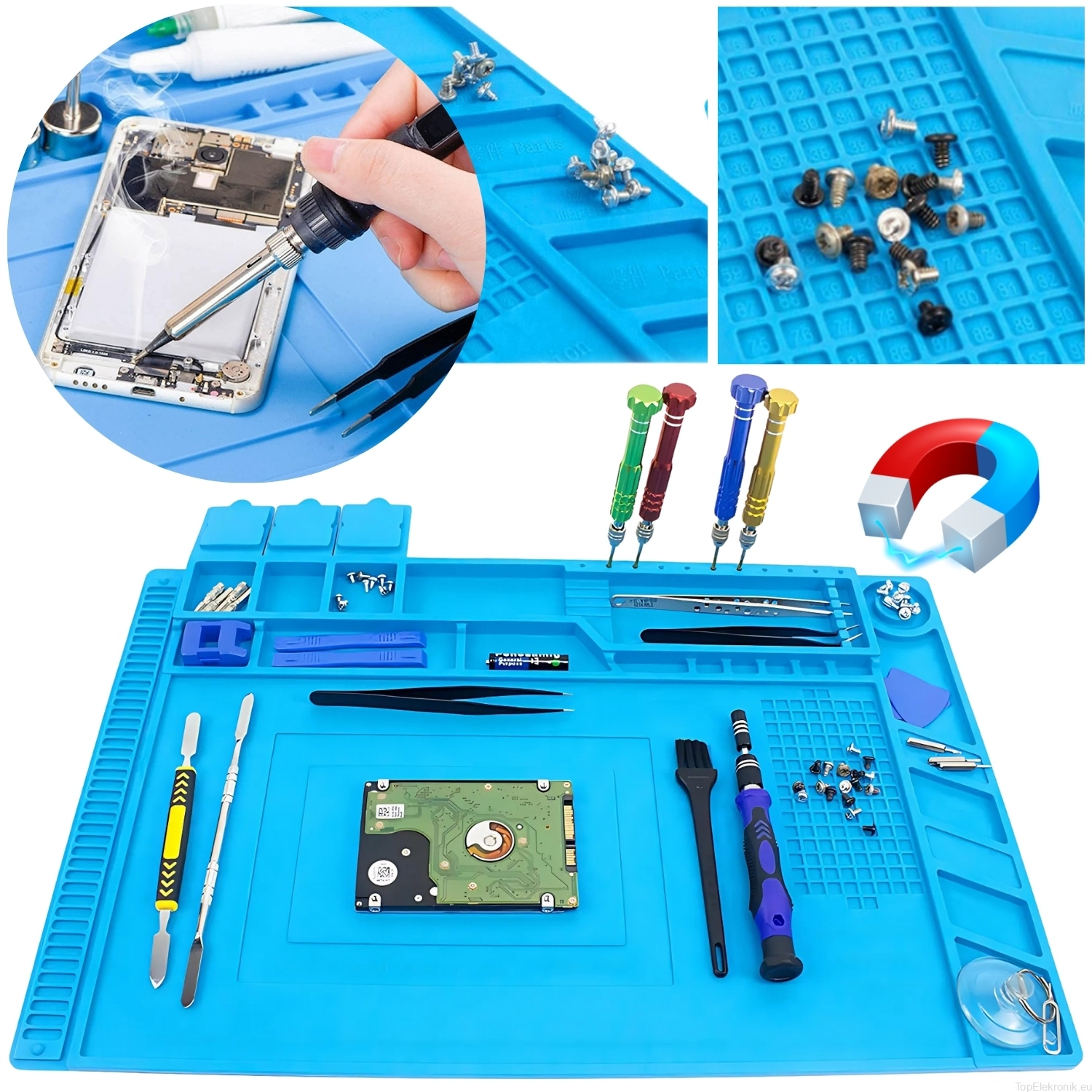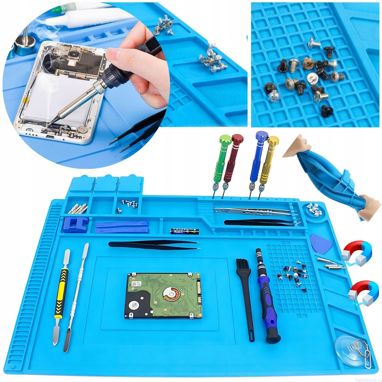 Mata wyposażona jest w 4 magnetyczne kieszonki, które skutecznie przytrzymują drobne elementy, takie jak śrubki czy części.