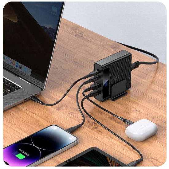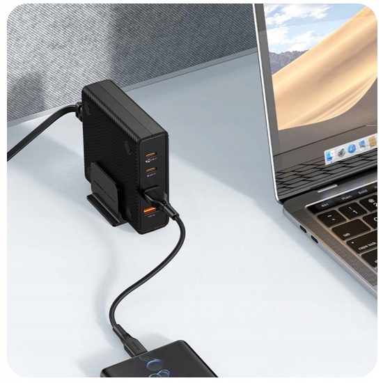 Zapomnij o stercie kabli na biurku i zastąp wszystkie ładowarki stylową stacją ładowania, którą postawisz dokładnie tam gdzie chcesz. Długi wygodny 1,5 metrowy kabel do gniazdka, możliwość ustawienia w pionie lub poziomie,4 porty ładowania i aż 100 watów mocy. Wszystko dedykowane pod Twoje centrum kontroli lotów.