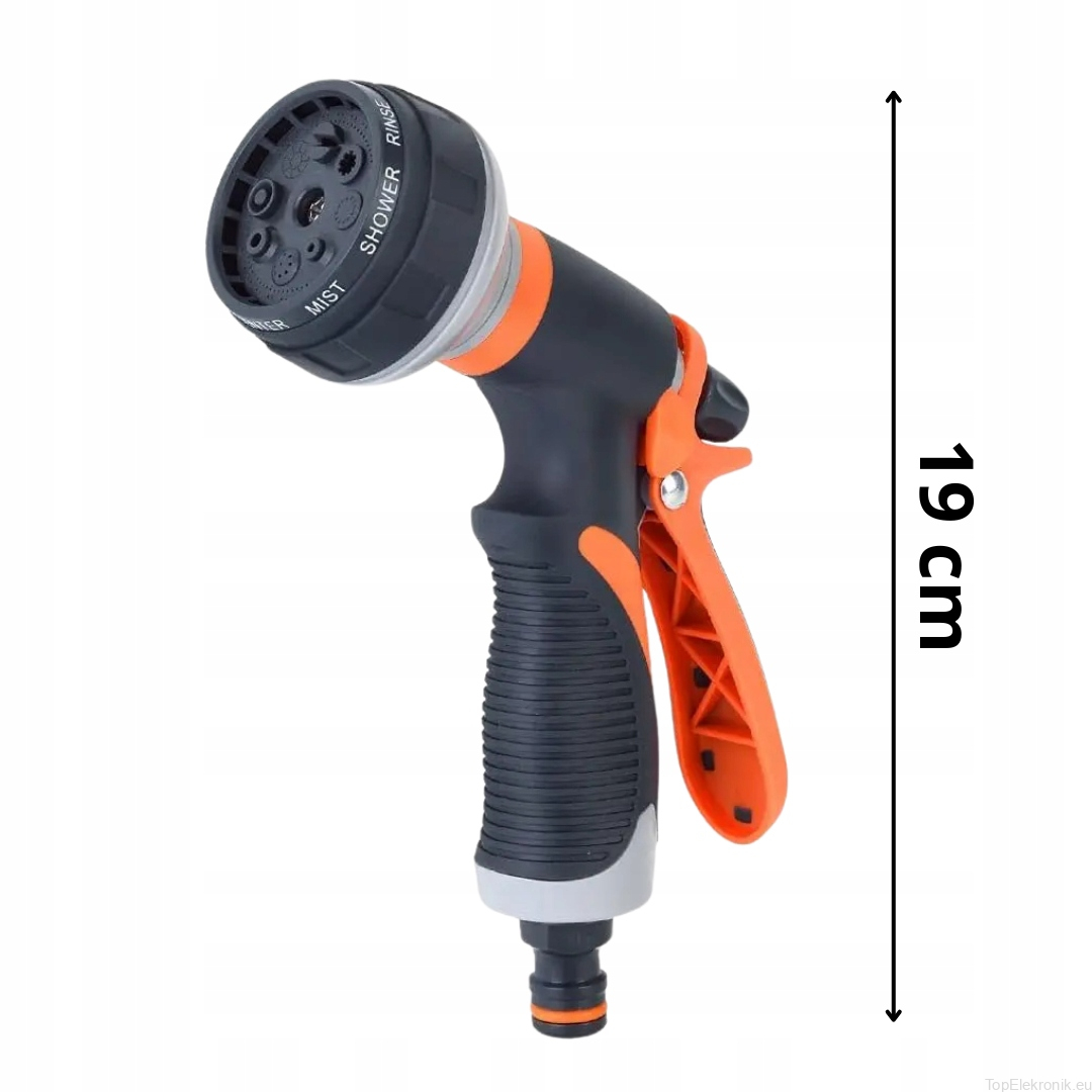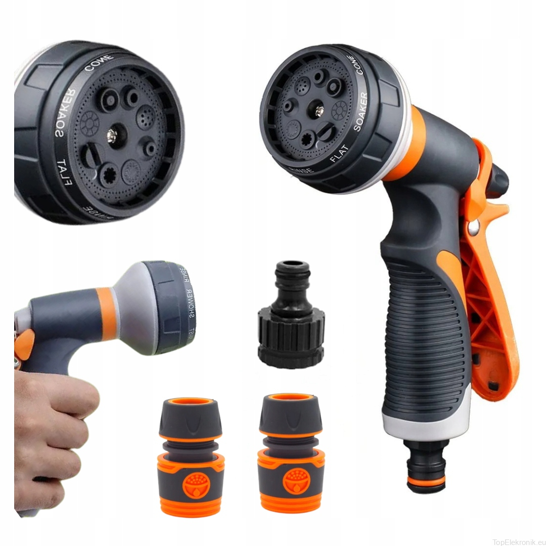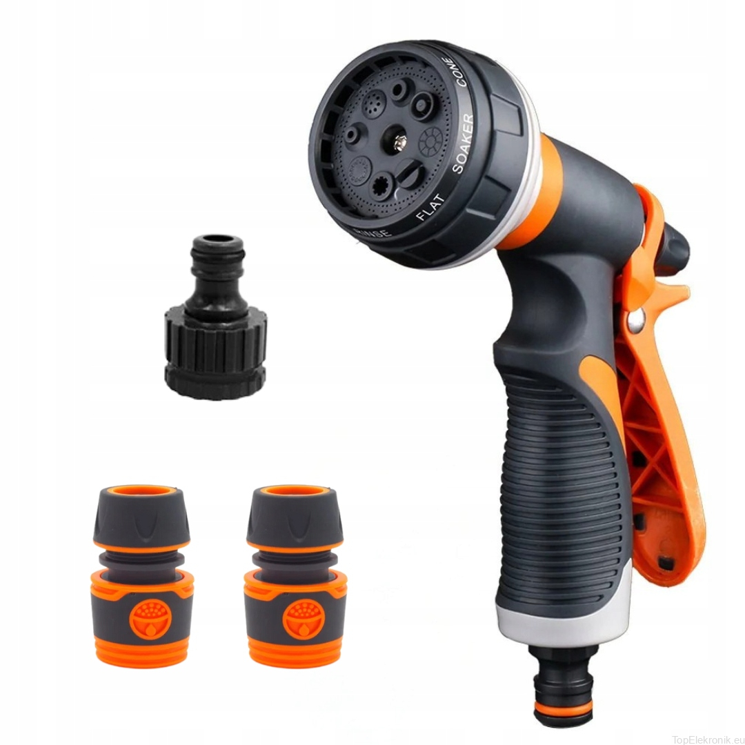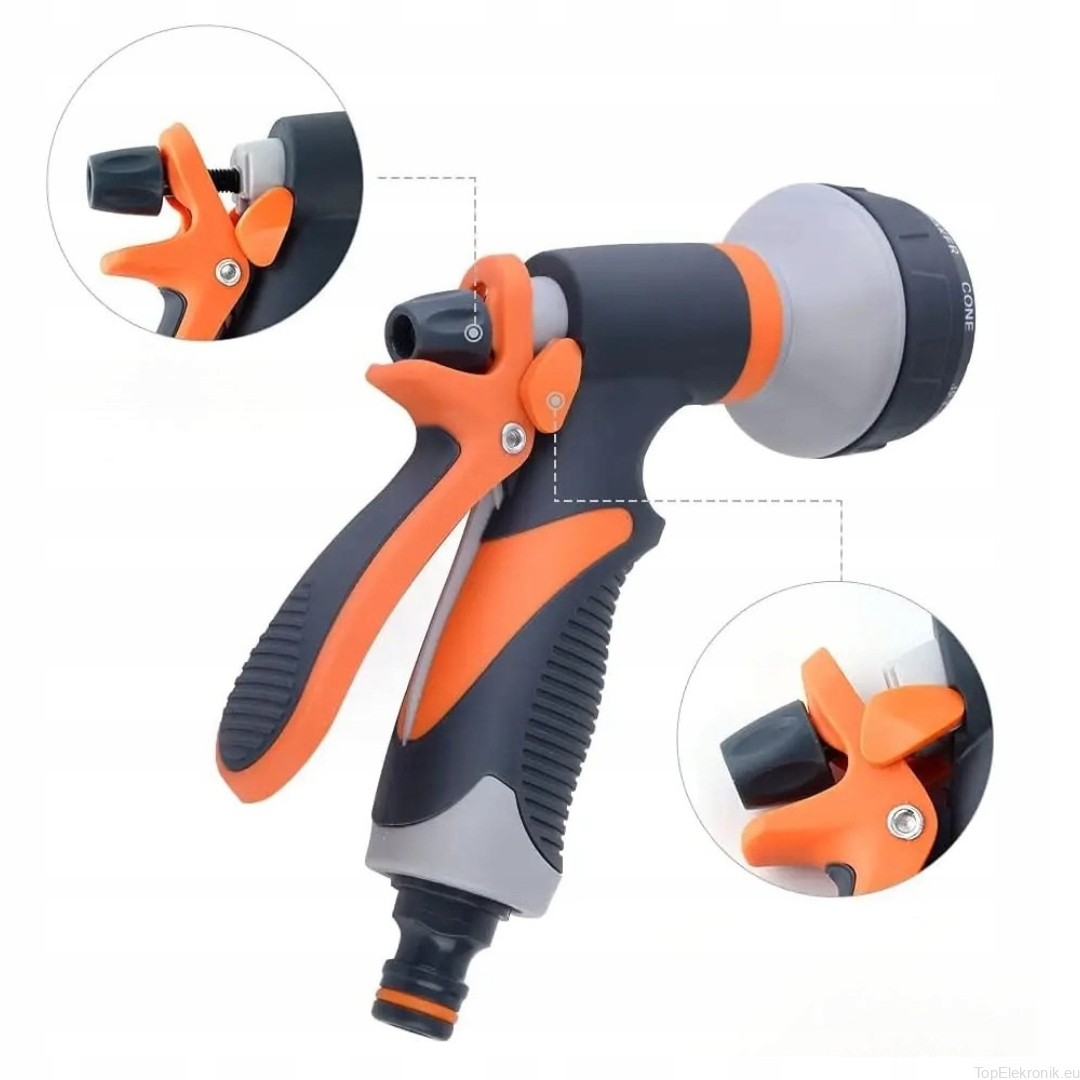 Wysokiej jakości pistolet zraszający wielofunkcyjny - 8 rodzajów strumienia z regulacją przepływu. Dobrze wyważony, idealnie trzyma się w dłoni. Posiada tryb pracy ciągłej.