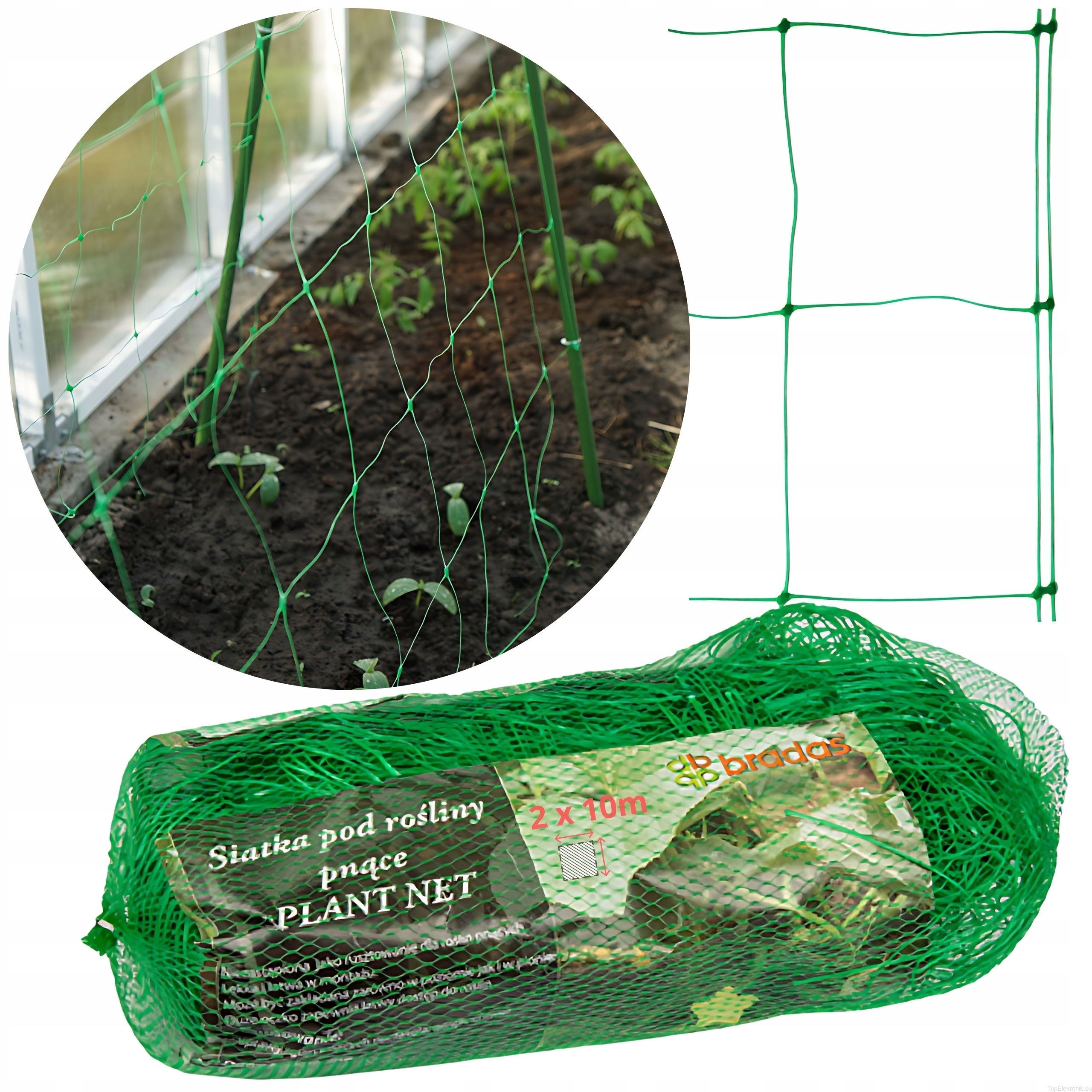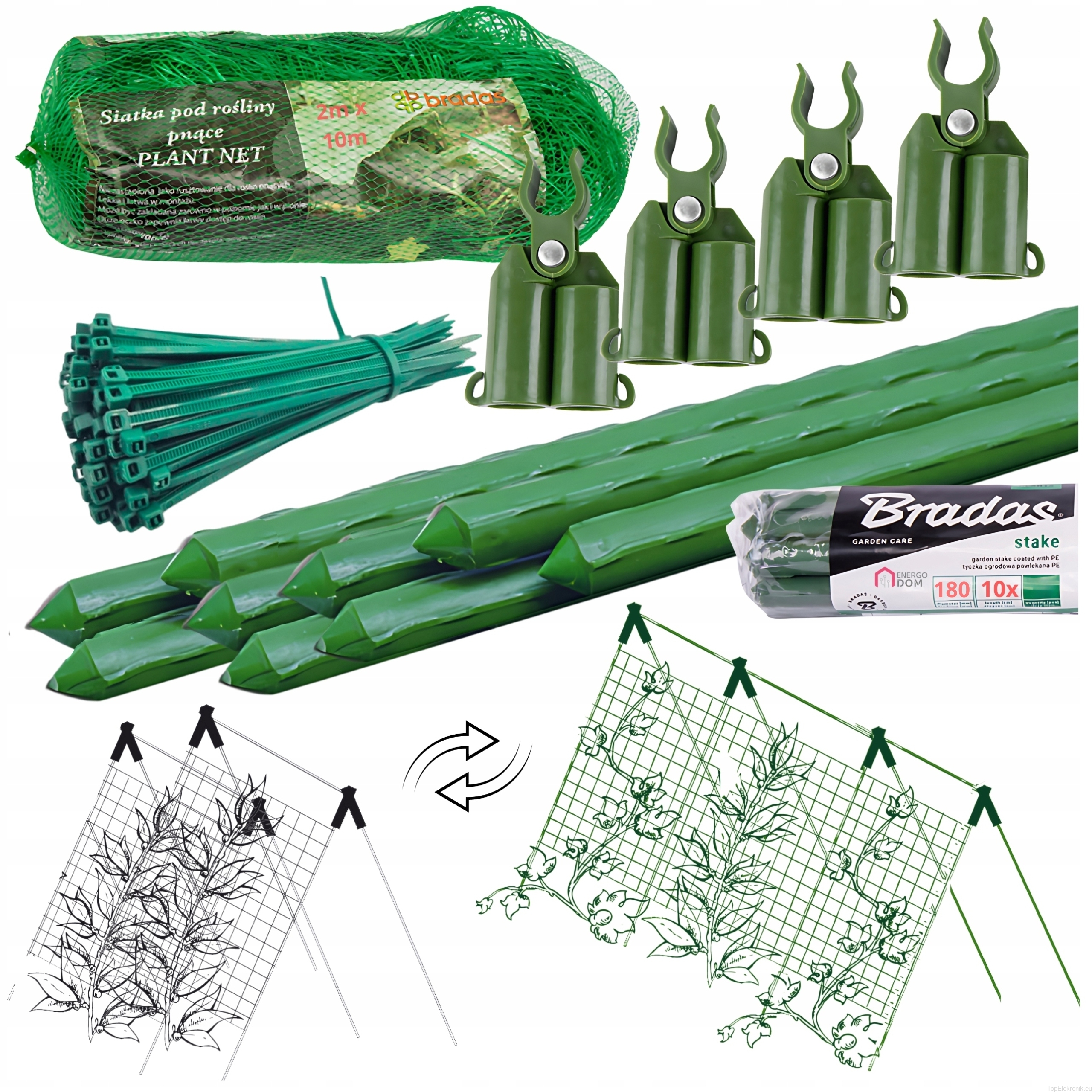 UWAGA w naszym zestawie z siatkę Plant Net oferujemy 10 tyczek 180cm (nie jak inni 7) , 4 łączniki szczytowe (nie 3) oraz zestaw 100 opasek zaciskowych.