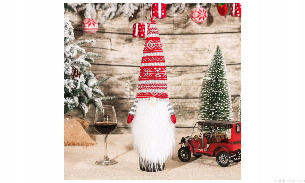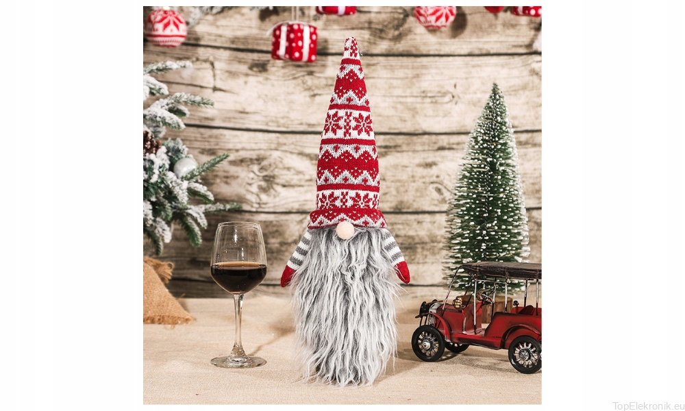 Ten uroczy skrzat na butelkę to idealny dodatek świąteczny do każdego domu. Jego czerwono-białe ubranie w tradycyjne wzory nawiązuje do zimowej atmosfery, a długa, puszysta broda dodaje mu charakteru. Czapka skrzata, rozciągająca się ku górze, jest ozdobiona delikatnymi, śnieżnobiałymi wzorami, które przypominają płatki śniegu. Różowe małe nosek dopełniaja całość, nadając mu sympatyczny i ciepły wygląd. Ten skrzat na pewno doda uroku każdej butelce, na którą zostanie założony, sprawiając, że będzie wyglądać jak prawdziwy prezent świąteczny!