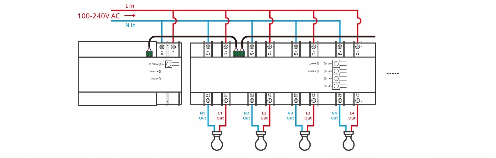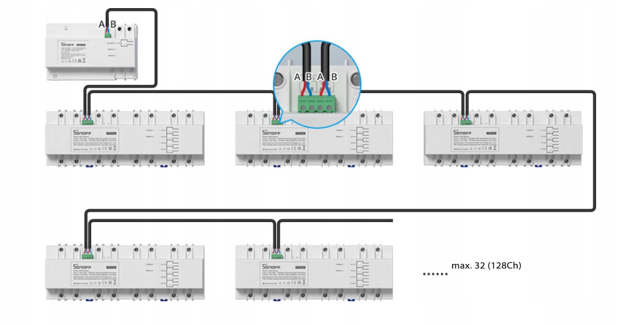 System pozwala na szeregowe podłączenie maksymalnie 32 modułów SPM-4Relay. Każdy do 20A oraz z pomiarem prądu / mocy