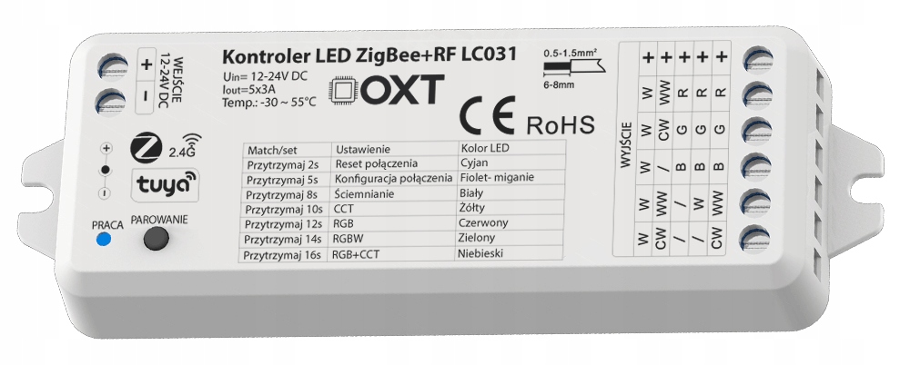 Zestaw oferuje sterownik taśm RGB+CCT. Dzięki temu w porównaniu do zwykłej taśmy RGB+W możemy również uzyskać najszerszą paletę barw (RGB) oraz każdy ocień światła białego (CCT). Od barwy ciepłej 3000K (WW) do barwy zimnej 6000K (CW)