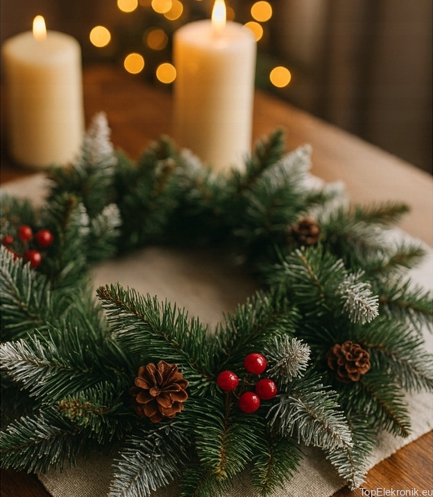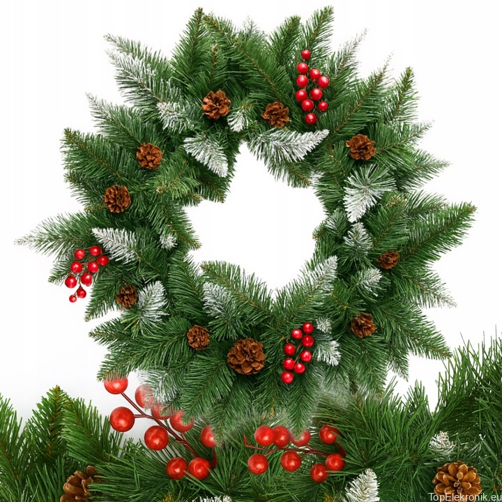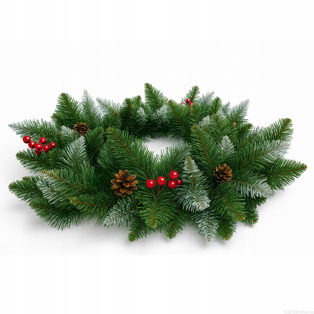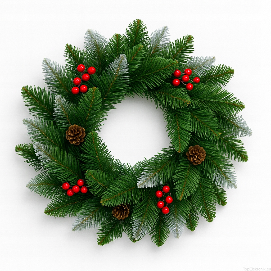 Elegancki wianek w zimowym stylu: gęste, zielone gałązki ze szronionymi końcówkami, naturalne szyszki i czerwone jagody. Realistyczny wygląd, pełna forma i neutralna kolorystyka sprawiają, że pasuje do każdego wnętrza – od klasyki po nowoczesność.
