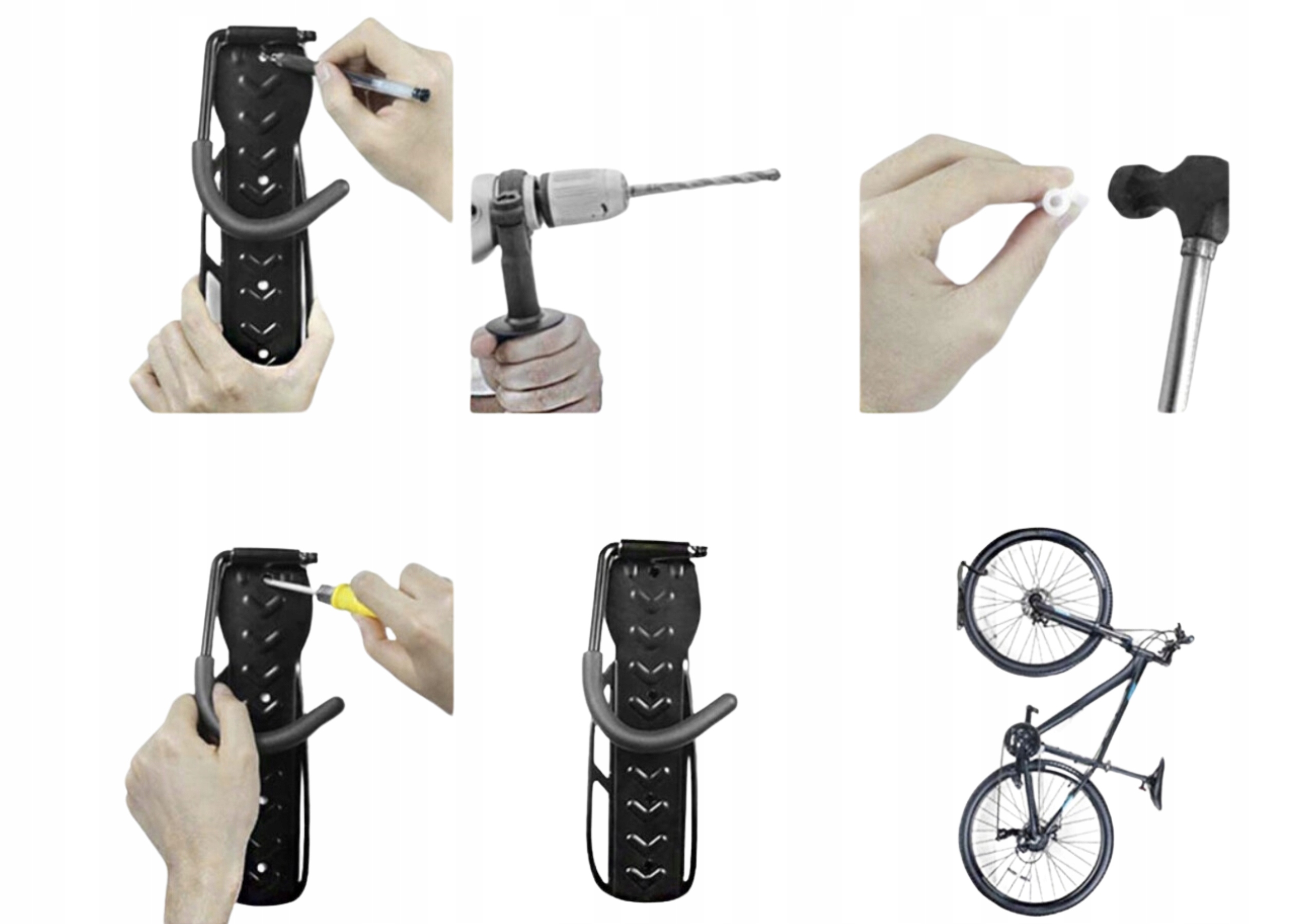 Solidna konstrukcja stalowa, zamocowana na kołki rozporowe, wytrzymuje obciążenie do 25 kg, co pozwala na zawieszenie większości rowerów dostępnych na rynku.