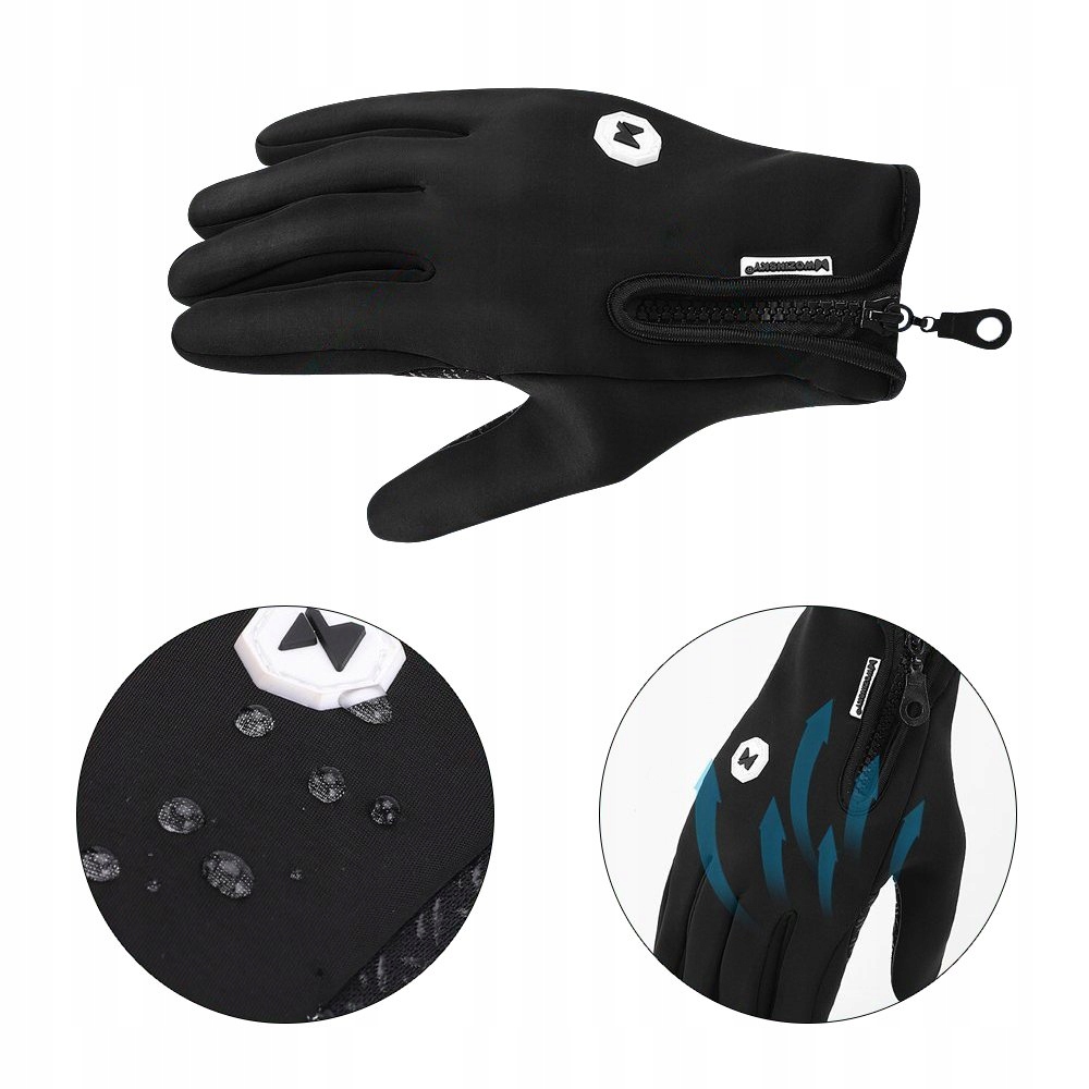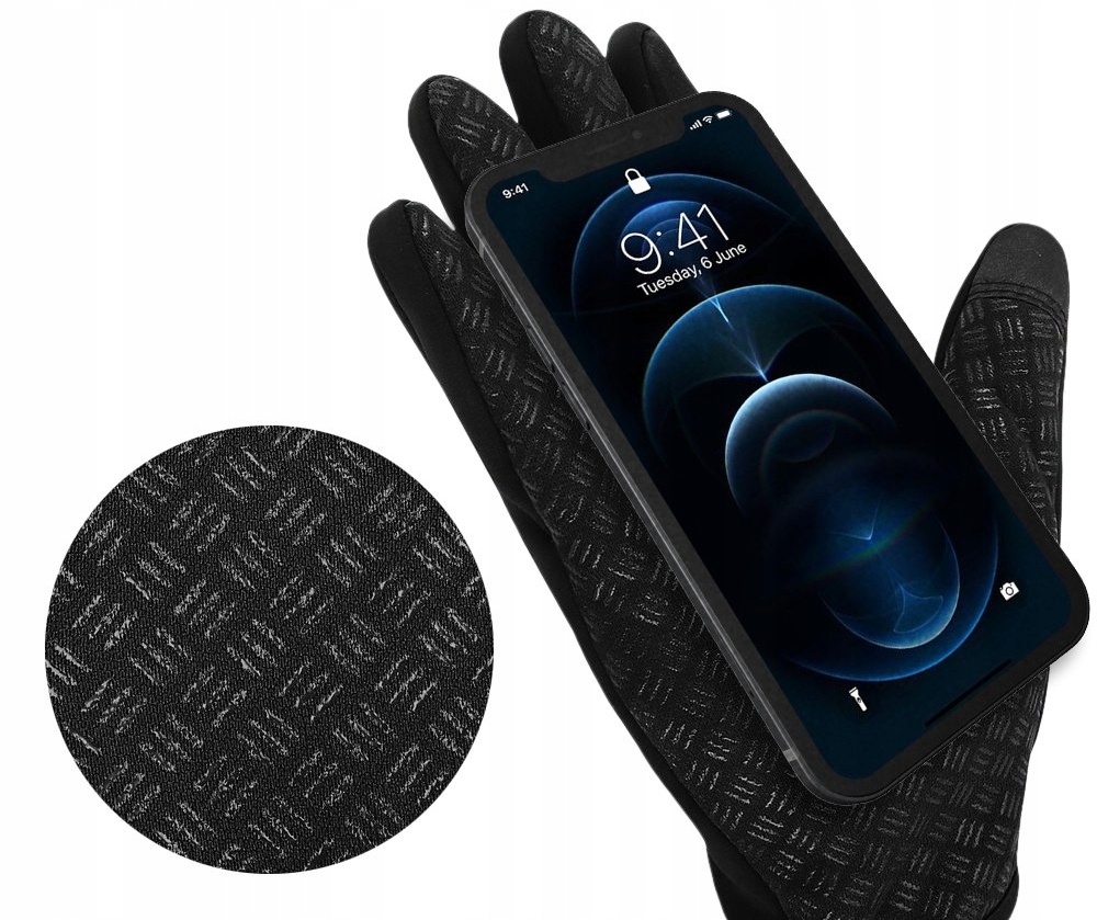 Rękawiczki są wodoodporne, nie przepuszczają wilgoci. Od wewnętrznej strony są pokryte antypoślizgową warstwą by poprawić uchwyt smartfona.