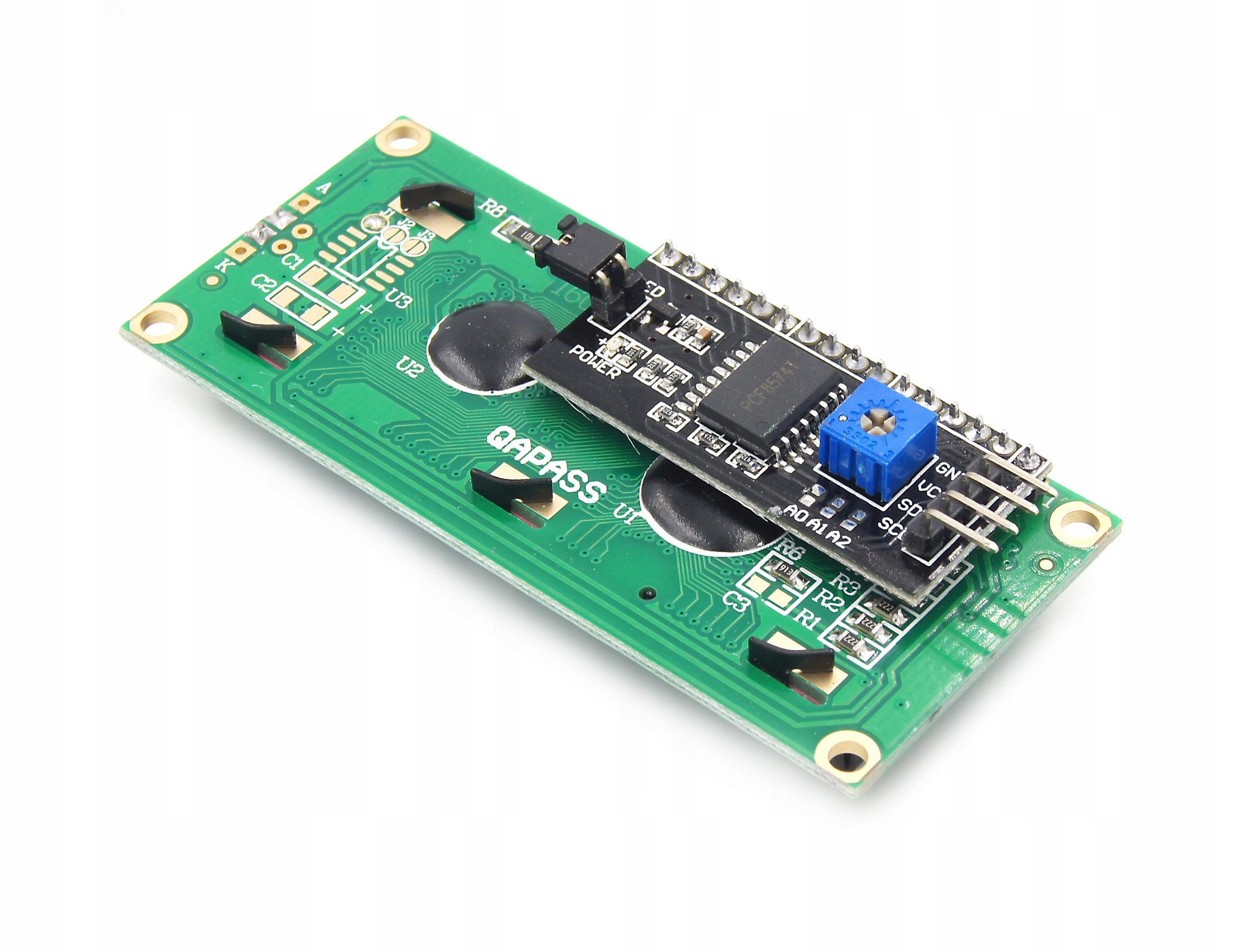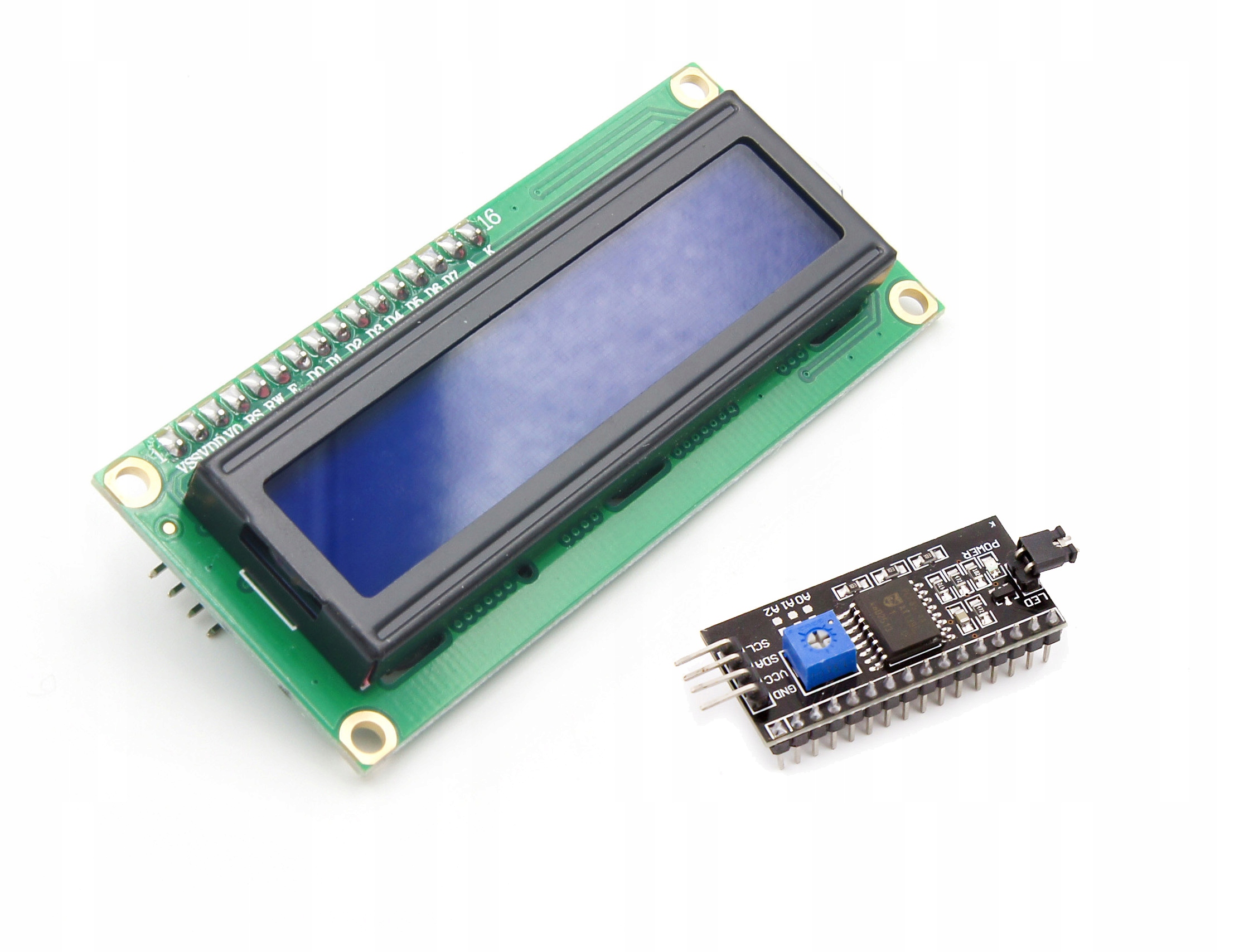 Wersję tą wyróżnia wlutowanym już konwerter I2C. Dzięki temu nie ma potrzeby prowadzenia do wyświetlacza wielu przewodów sygnałowych (które zajmują wiele pinów w Arduino). Wszystko obsłużysz tylko dwiema liniami SDA oraz SCL.