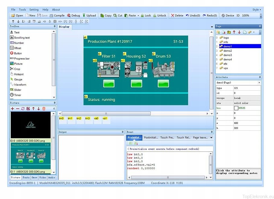 Korzystając z oprogramowania NEXTION Editor, możesz szybko opracować interfejs GUI HMI, przeciągając i upuszczając komponenty (grafika, tekst, przycisk, suwak itp.) oraz instrukcje tekstowe ASCII do kodowania interakcji komponentów po stronie wyświetlacza.