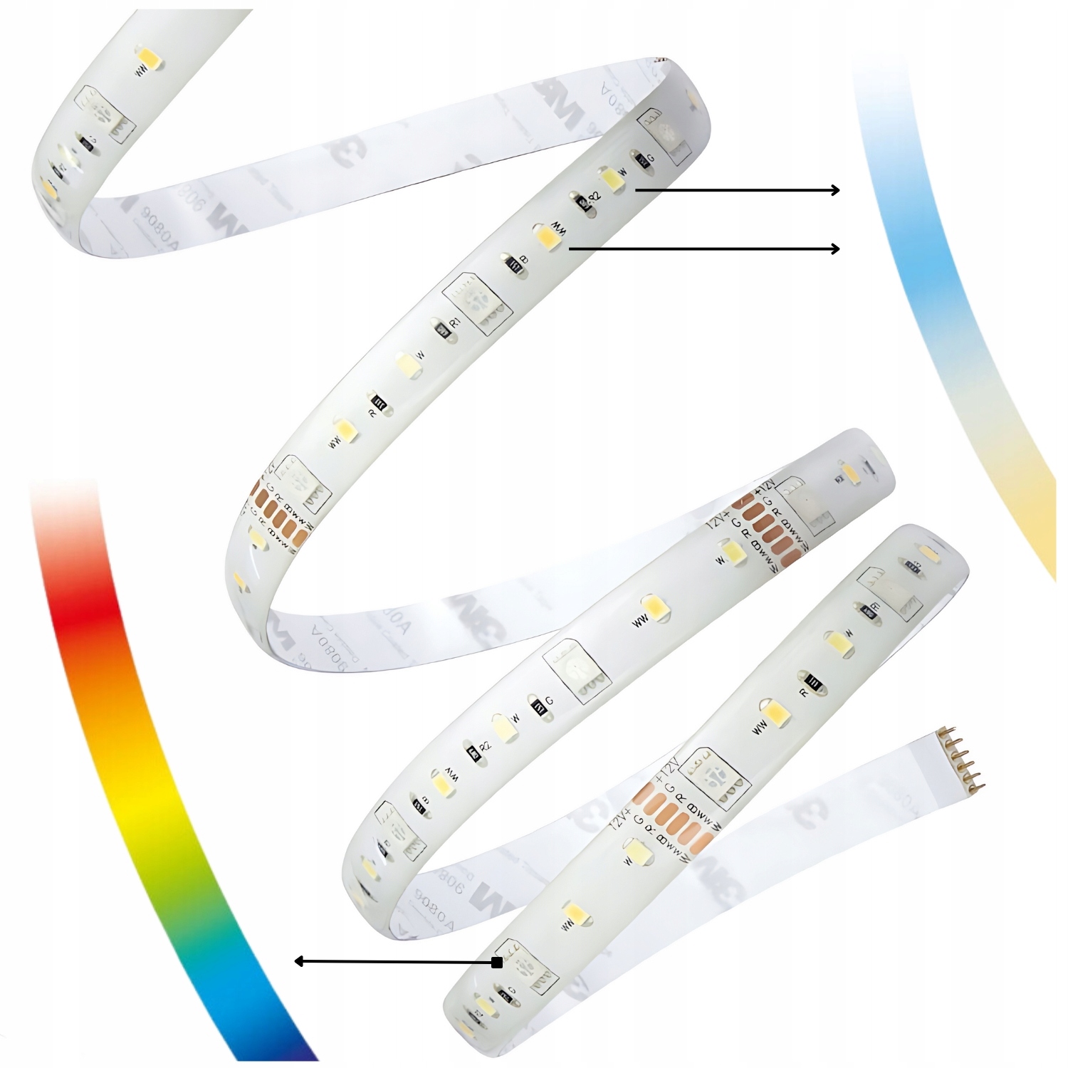 Dzięki połączeniu RGB + CCT w porównaniu do zwykłej taśmy RGB lub RGB+W otrzymujemy pełną możliwość sterowania: